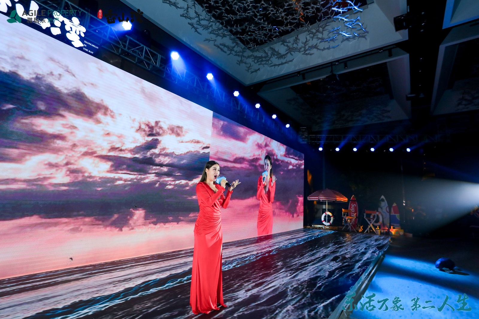 通往主會場的走廊上,流線性的表達(dá),藍(lán)色天地幕布景,26米海天一線連屏全沉浸式超實(shí)舞美,將雅居樂·香山灣26公里的絕美海岸線“搬運(yùn)至”現(xiàn)場。3D特效的落地,聲臨其境的感官特效,讓現(xiàn)場的每一位體驗(yàn)者都置身于大海環(huán)繞的純凈之地。
