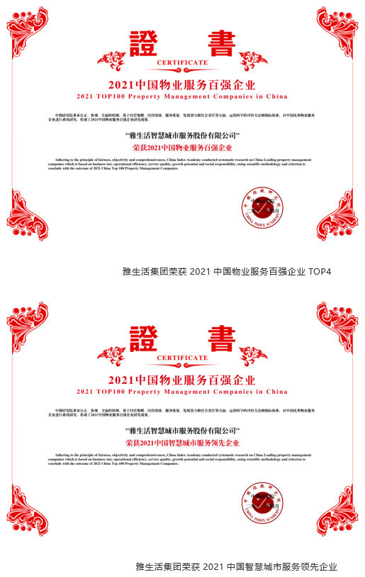 4月22日,由中國指數(shù)研究院、中國房地產(chǎn)TOP10研究組共同主辦的“2021中國物業(yè)服務企業(yè)百強研究成果發(fā)布會暨第十四屆中國物業(yè)服務百強企業(yè)家峰會”在北京隆重舉行。雅生活集團以搶眼的業(yè)績表現(xiàn)和卓越的運營能力,蟬聯(lián)2021中國物業(yè)服務百強企業(yè)TOP4,以及成長性、服務質(zhì)量、滿意度領先等九項殊榮,品牌影響力再上新臺階。